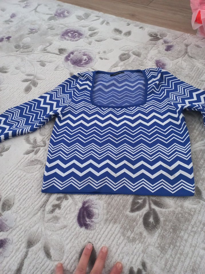 Mavi ve gri zigzag desenli, uzun kollu, örgü triko kadın kazak. Fitted kesim ve tekne yakalı, günlük kullanıma uygun rahat bir parça.