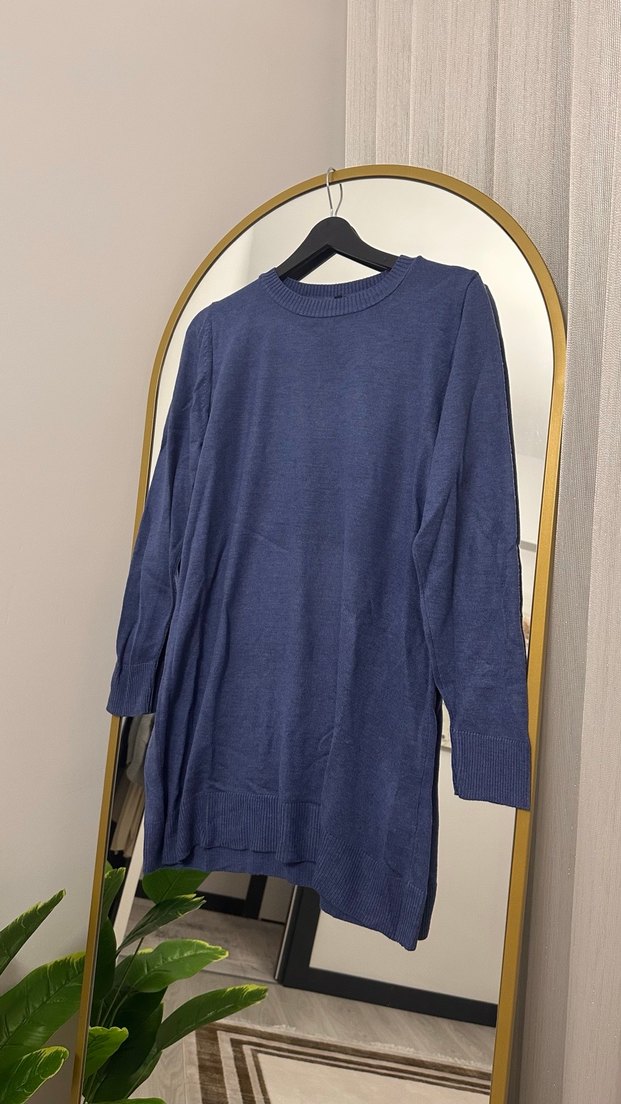 Mavi renkli, uzun kollu ve yuvarlak yakalı örme triko. Rahat ve bol kesimiyle günlük kullanıma uygun, sade ve desensiz tasarım.