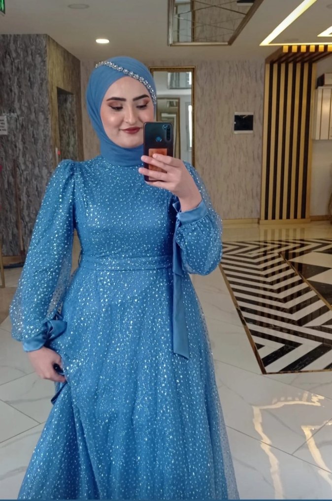 Parlak mavi, uzun kollu, yüksek yakalı ve tie-dye desenli, payetli, uzun boy, vücuda oturan abiye elbise. Düğün için uygundur. ✨
