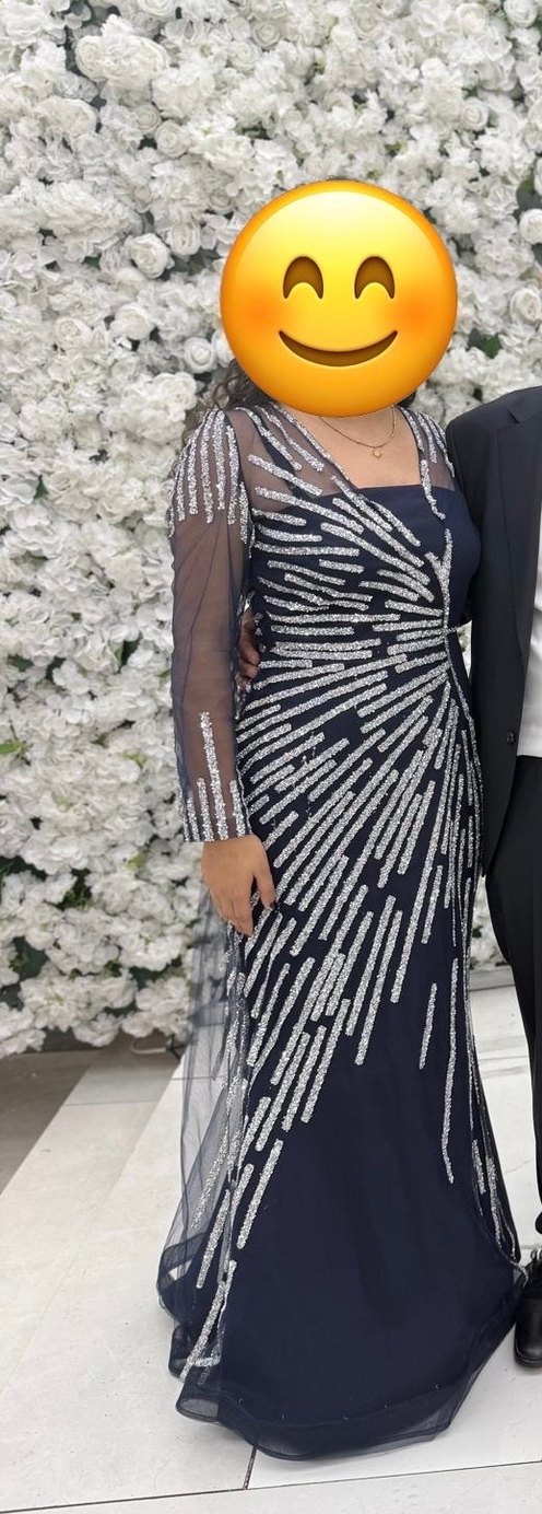 Koyu mavi renkli, V yakalı ve uzun tüllü kollu, payet desenli şık ve modern kesim uzun abiye elbise. Düğünler için uygun, zarif ve göz alıcı ✨