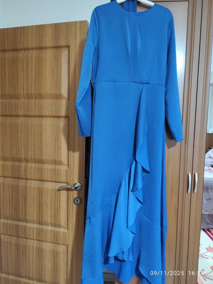 Mavi Uzun Kollu Pilili Kadın Elbise