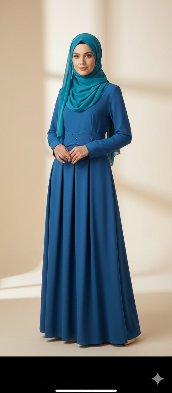 Koyu mavi renkte, tek renk, tek parça uzun kadın elbisesi. Tekne yakalı, piliseli etekli, uzun kollu, sentetik kumaştan, ofis ortamına uygun. hafif Tuylenme var