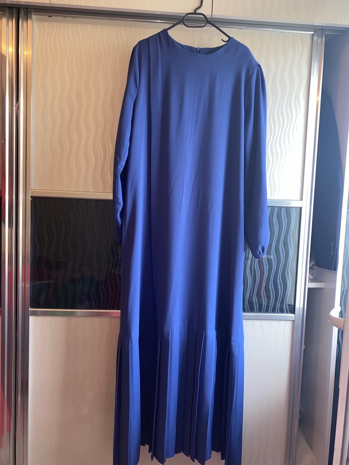 Koyu mavi uzun kollu, yuvarlak yaka ve piliseli etek uçlu elbise. Yumuşak sentetik kumaştan, bol ve sade kesimlidir, günlük kullanıma uygundur. Kusuru yoktur dar geldığı için satıyorum hiç giyilmedi sıfır