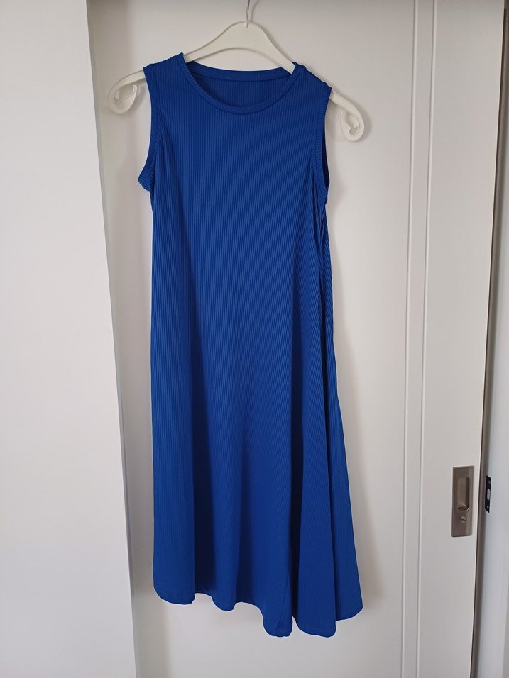 Mavi renkte, yüksek yakalı ve kolsuz uzun elbise. Gevşek kesimi ve pliseli detaylarıyla minimalist ve normcore tarzına uygun, yumuşak sentetik kumaştan yapılmıştır.