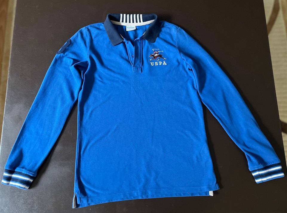 Düğmeli yakası ve yumuşak kumaşıyla mavi, uzun kollu, fitted kesim polo tişört. USPA logosu bulunur, sportif sokak giyimi için uygundur.
