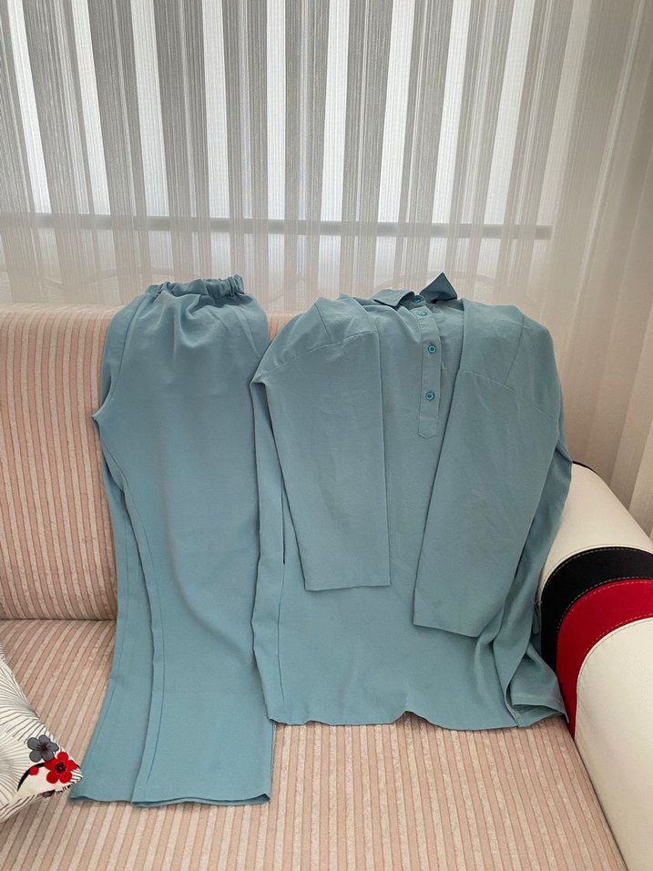 Uzun kollu, rahat kesim ve bisiklet yaka tasarımlı pijama takımı. Dökümlü, sade mavi kumaştan, günlük rahatlık sunar.