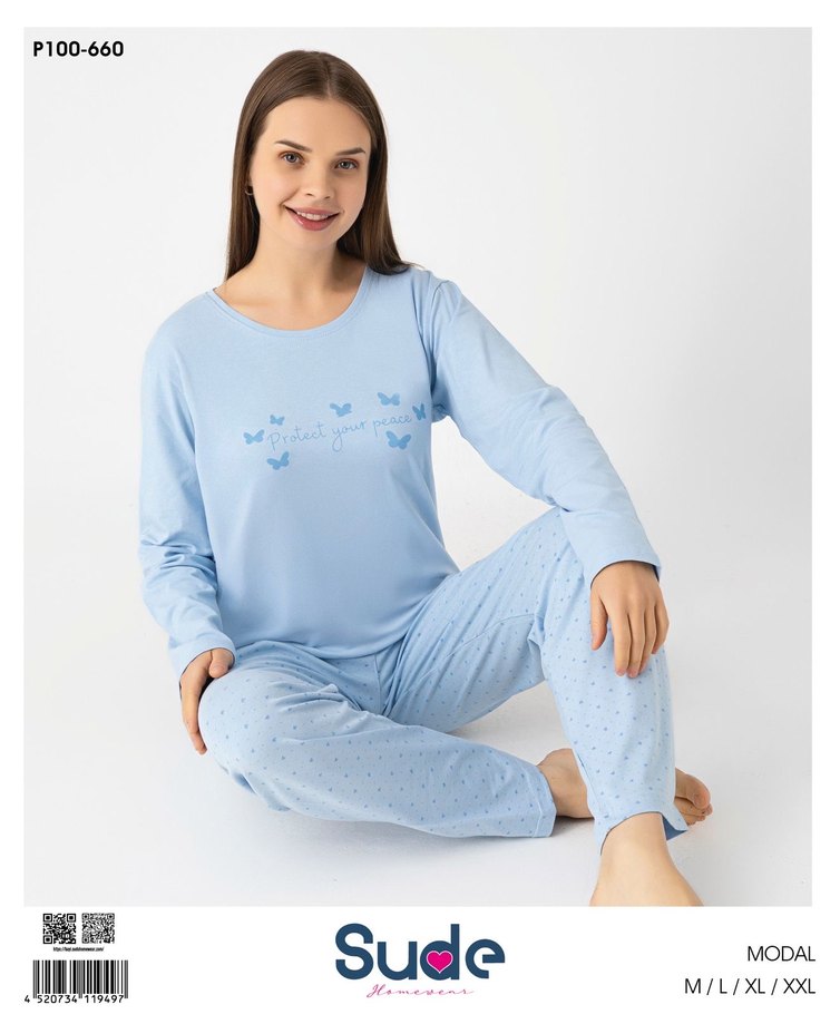 Uzun kollu ve midi boy pantolonlu, pastel mavisi rahat kesim kadın pijama takımı. Hafif kelebek baskılı ve yumuşak kumaşlıdır. M/L/XL beden seçenekleri mevcuttur.