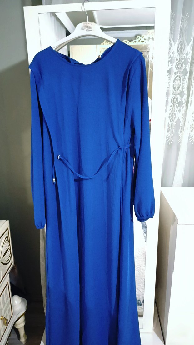 Mavi uzun kollu elbise, yuvarlak yakalı ve salaş kesimdir. Yumuşak sentetik kumaştan, drapeli detaylıdır. Günlük sokak stili için uygundur.