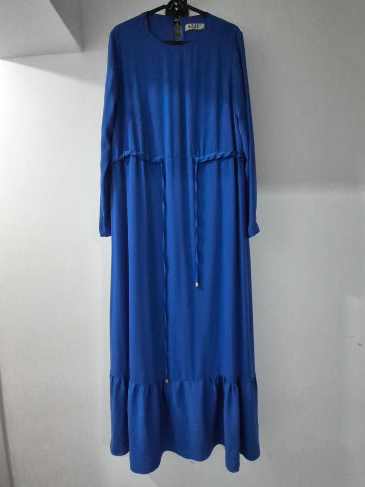 Mavi uzun elbise, salaş kesim ve bel ile etek kısmında fırfır detaylarına sahiptir. Yuvarlak yaka ve uzun kolludur, sentetik kumaştan üretilmiştir.