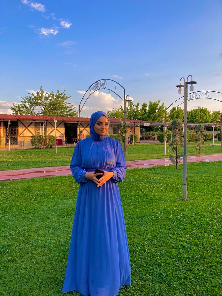 Mavi uzun kollu elbise, yüksek yakalı ve salaş kesimdir. İpeksi kumaştan tesettür abiye. Şalı da medine ipeğidir.