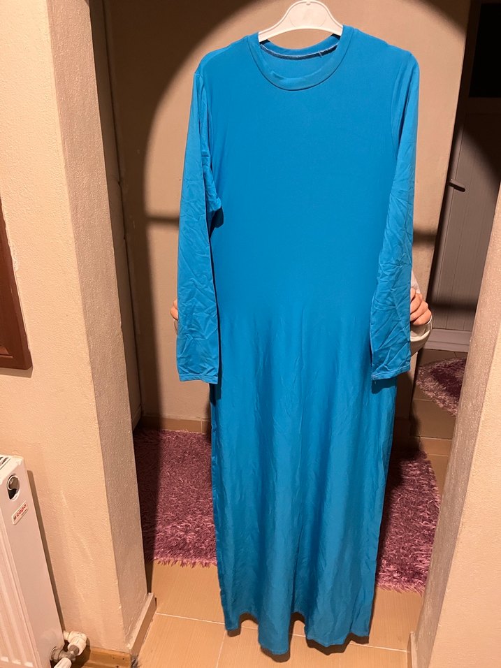 Mavi renkte, uzun kollu, salaş kesim, yuvarlak yakalı ve dökümlü tasarıma sahip sentetik kumaştan kadın elbisesi. el dikimi