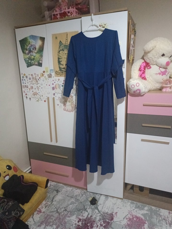 Uzun kollu, salaş kesim mavi elbise, yuvarlak yakalı ve drapeli tasarıma sahiptir. Sentetik kumaştan yapılmış, minimal bohem tarzda günlük kullanıma uygundur.