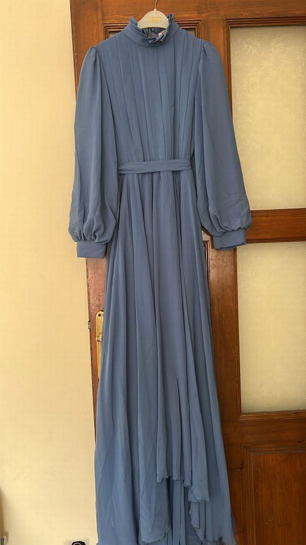 Mavi uzun elbise, salaş kesim ve drapeli detaylara sahip. Yüksek yakalı ve ince askılı, ipeksi kumaştan modern klasik tarzda, ofis için uygun. 36 38 beden uyumlu şalıyla bırlıkte gonderılıcektır tertemız sadece bı kez bıkac saatlık gıyıldı
