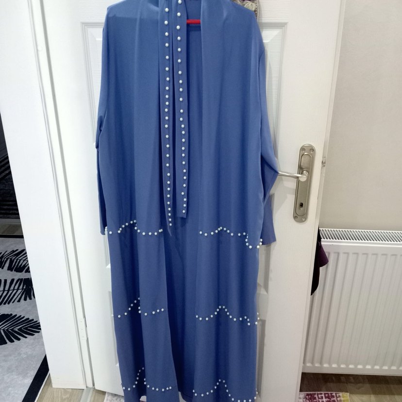Uzun, salaş kesim kadın elbise, yakalı ve drapeli tasarıma sahip. İpek gibi parlak mavi kumaştan, uzun kollu ve inci detaylı minimal, sade stil sunar. Günlük kullanım için uygun. 44/52 beden olur