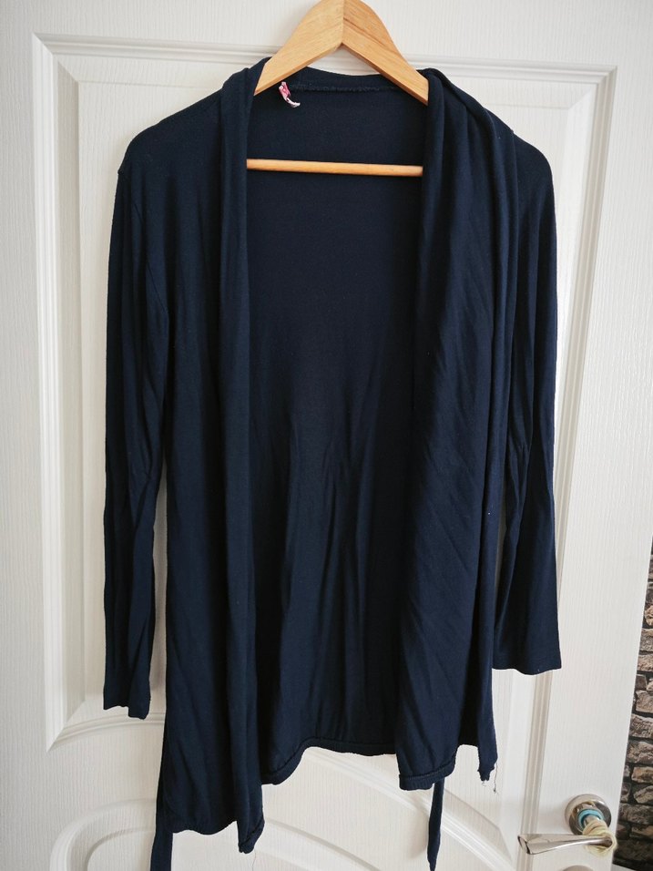 Mavi keten kumaştan, uzun kollu, salaş ve drapeli kadın hırka. Midi boyda, sade ve günlük kullanıma uygun.