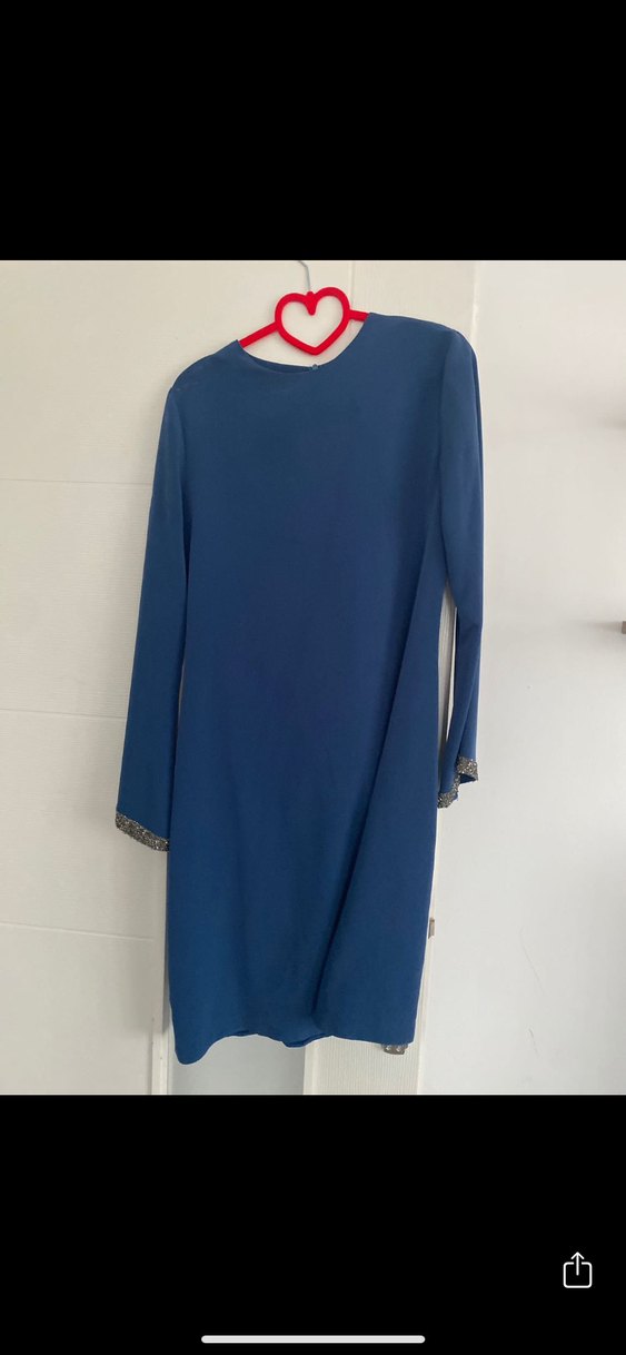 Mavi, uzun kollu, salaş kesim ve dökümlü kadın tunik. İpek gibi parlak kumaştan, ofis için uygun minimal ve sade tarzda. 1-2 kez giyildi sorunsuz bayramlık özel günler için çok şık ve kaliteli bir takım Tuğba markasından almıştım 38-40 uyumlu