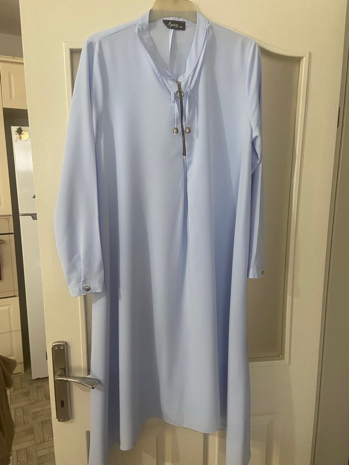 Mavi, uzun kollu ve salaş kesimli kadın tunik. Yaka detaylı, dökümlü ve sade tasarımlı, ince ve yumuşak kumaştan üretilmiştir. 1 defa giyildi