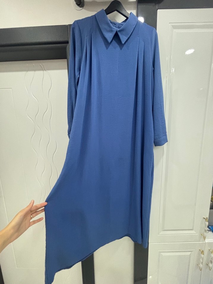 Koyu mavi renkte, salaş kesim, drapeli ve yakalı uzun kollu keten elbise. Asimetrik etek ucu ile ofis için uygundur.