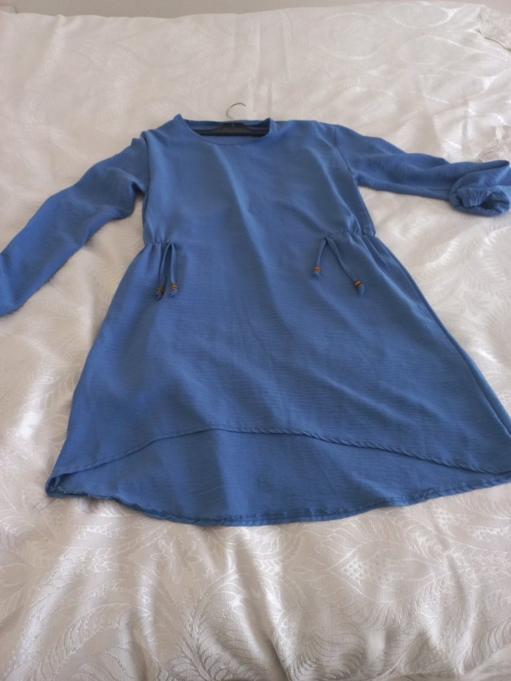 Mavi renkte, uzun kollu ve salaş kesim keten tunik. Uzun boyu ve drapeli tasarımıyla günlük kullanıma uygun parlak, bohem tarzda.