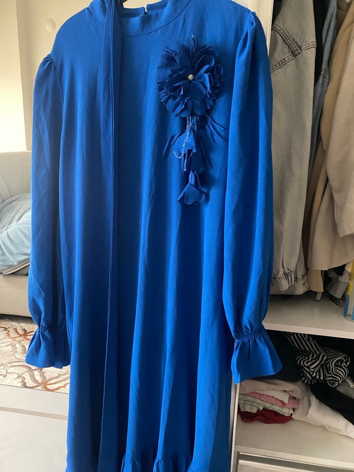 Mavi renkli, yüksek yakalı ve uzun kollu, saten kumaştan yapılmış uzun elbise. Nakış detaylı, göğüste çiçek süslemeli, bol kesim ve volanlı manşetlere sahip. Ofis için uygundur.
