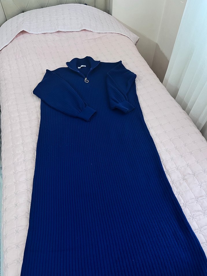 Parlak mavi uzun elbise, yüksek yakalı ve uzun kolludur. Yumuşak ve sıcak dokuma kumaştan, rahat ve bol kesimlidir. Günlük kullanıma uygundur.