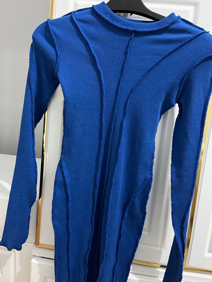 Parlak mavi sentetik kumaştan, yüksek yakalı, uzun kollu, vücuda oturan uzun triko kadın elbisesi. Sokak modası ve athleisure tarzına uygun.