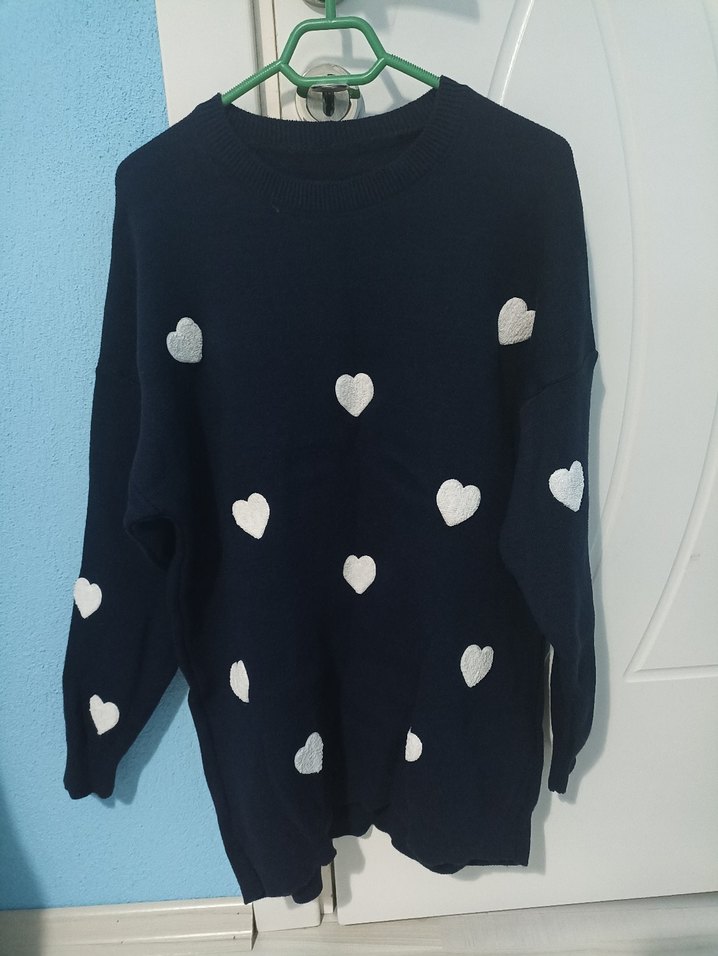 Uzun kollu, bisiklet yaka kadın kazak, yumuşak triko kumaştan. Gevşek kesim ve midi boyda, küçük kalp desenleriyle süslenmiş, rahat sokak stili için uygun.