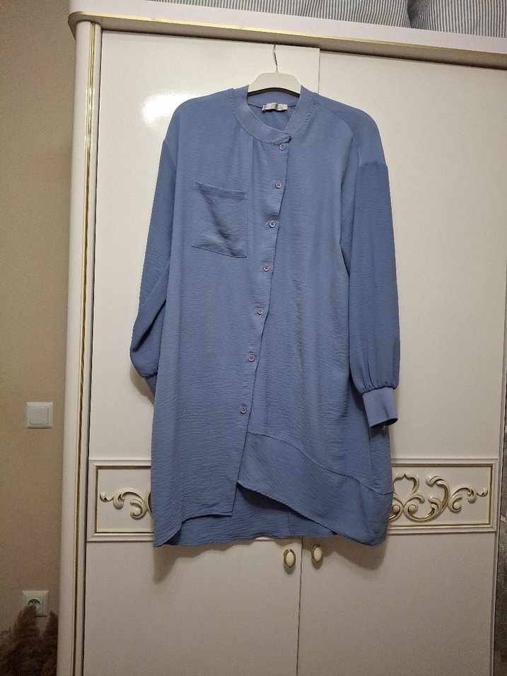 Mavi keten kumaştan, düğmeli, uzun kollu, bol kesim kadın gömleği. Minimalist ve normcore tarzıyla günlük kullanıma uygun.