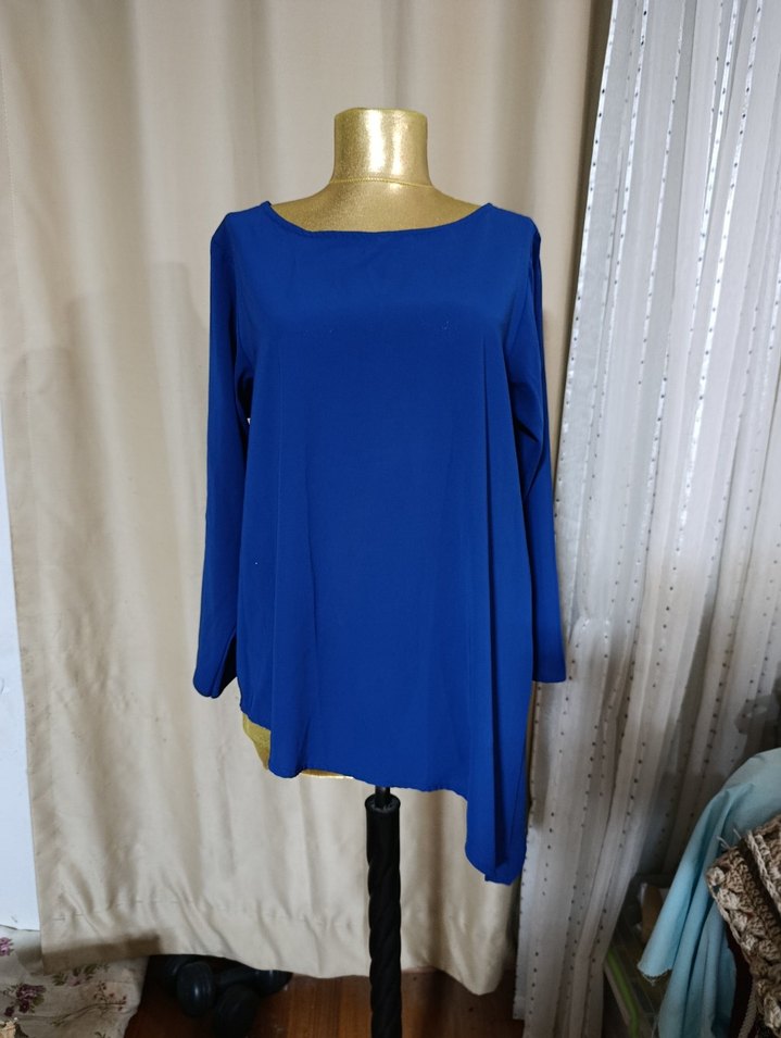 Mavi renk, uzun kollu, yuvarlak yakalı, bol kesim, satenimsi kumaştan midi boyda, drapeli tunik, günlük kullanım için uygun.