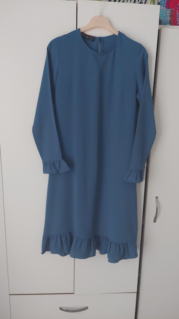 Mavi, uzun kollu, yüksek yakalı tunik. Günlük kullanım için drapeli ve volanlı etek ucu bulunur.