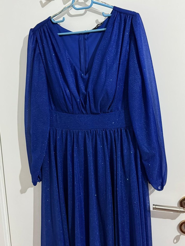 Mavi renkli, V yakalı ve uzun kollu drapeli uzun abiye elbise. Rahat kesimi ve parlak dokusuyla düğün ve özel günler için uygundur. 1 kere giydim