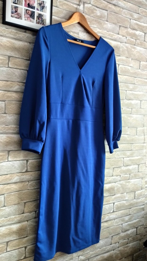 Mavi renkte, V yaka ve drapeli detaylı uzun kollu kalem elbise. Sentetik kumaştan üretilmiş, modern klasik stile sahip ve iş ortamına uygundur.
