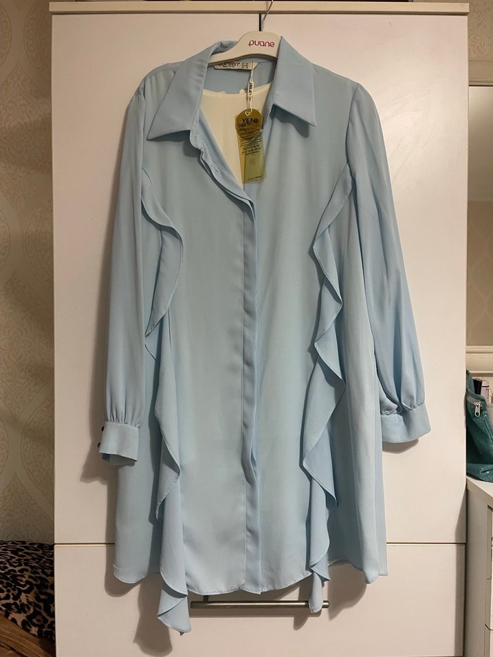 Pastel mavi renkte, yakalı ve yanlarda volan detaylı uzun tunik. İpeksi kumaştan, bol kesim ve uzun kollu, bohem tarz için uygundur.
