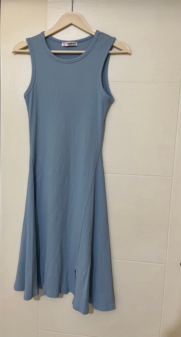 Yüksek yakalı, kolsuz ve pastel mavi renkte, vücuda oturan uzun elbise. Pürüzsüz sentetik kumaştan, minimalist ve zahmetsiz şıklık sunar.