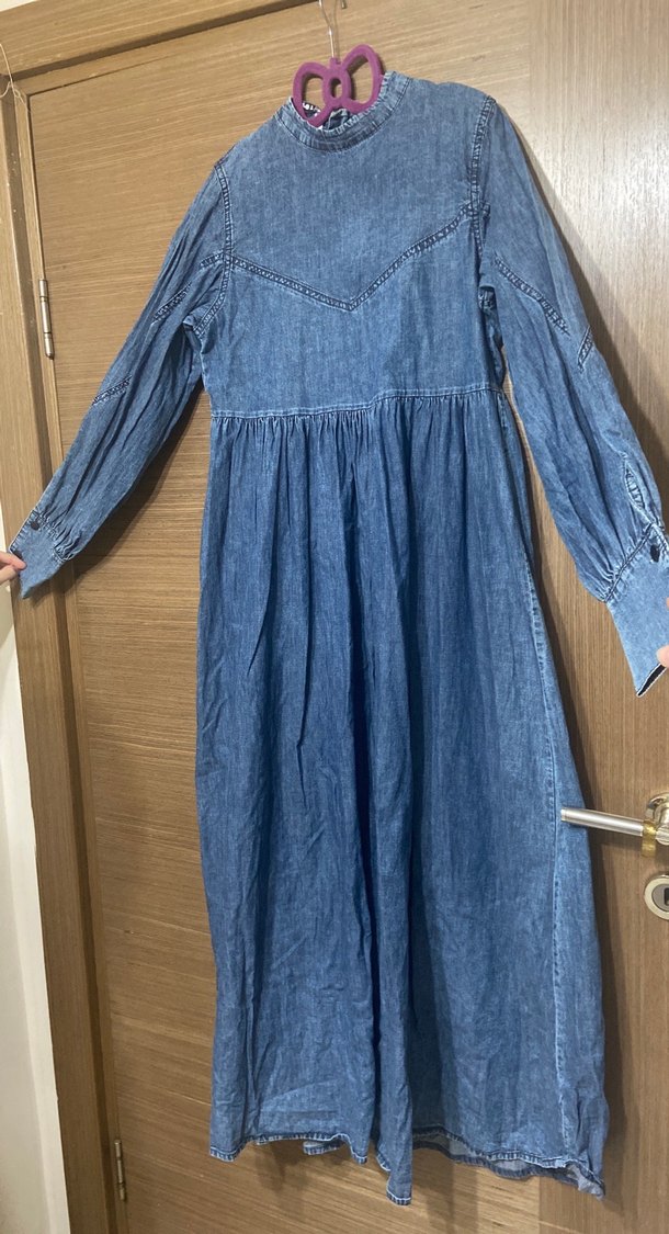 Mavi uzun kot elbise, pileli detaylar ve uzun kollu, bol kesim ile V yakalıdır. Günlük bohem tarz için uygundur. Hiç giyilmedi.