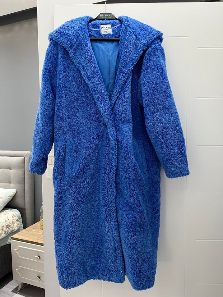 Yumuşak ve sıcak peluş kumaştan yapılmış, kapüşonlu ve yan cepli uzun mavi kaban.