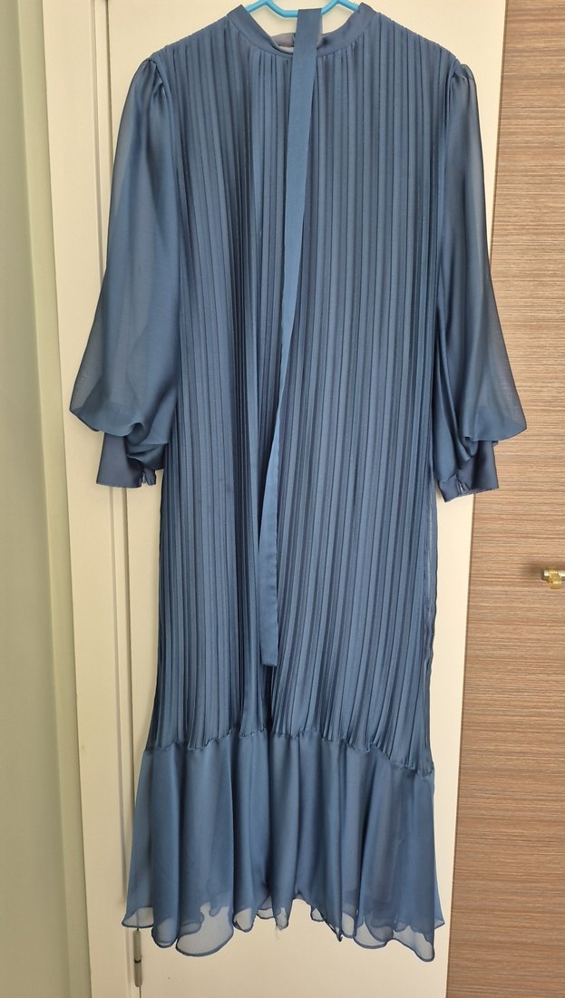 Mavi renkte, pilili detaylara sahip uzun ve bol kesim kadın elbisesi. Sentetik kumaştan, askılı kollu ve yüksek yakalı, desensiz tasarım, ofis için uygun.