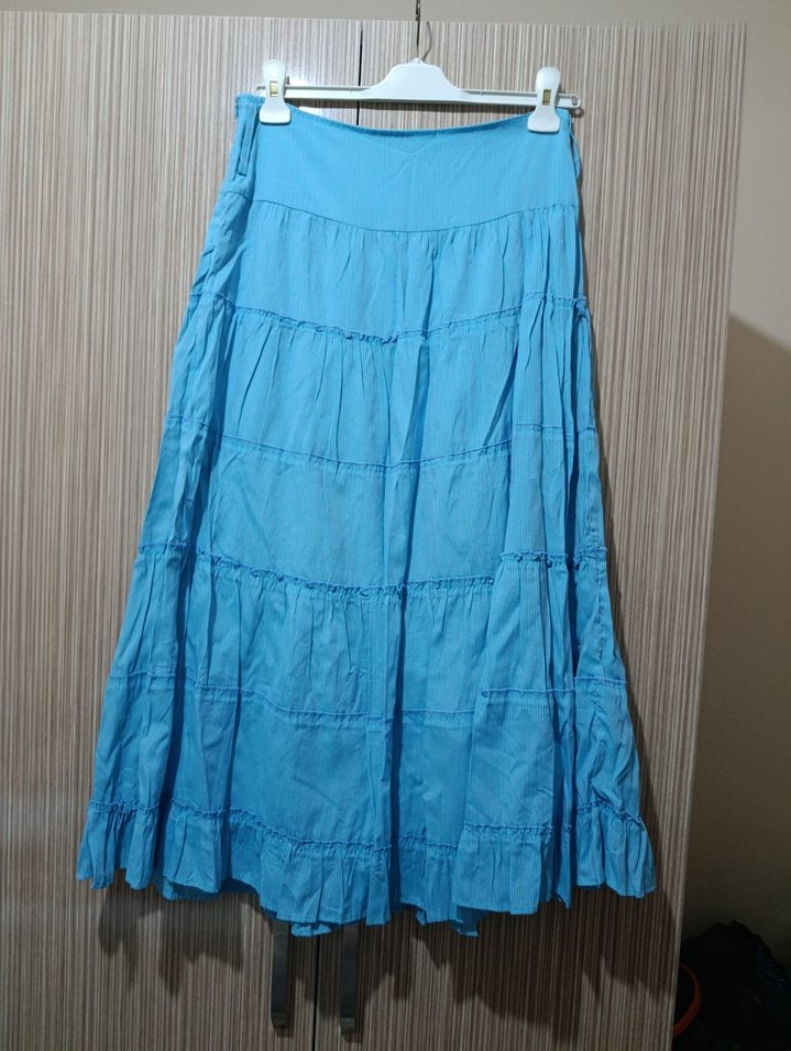 Mavi uzun pilili keten etek, bol kesimi ve yumuşak dokusuyla bohem tarzını yansıtıyor. Günlük kullanım için uygun.