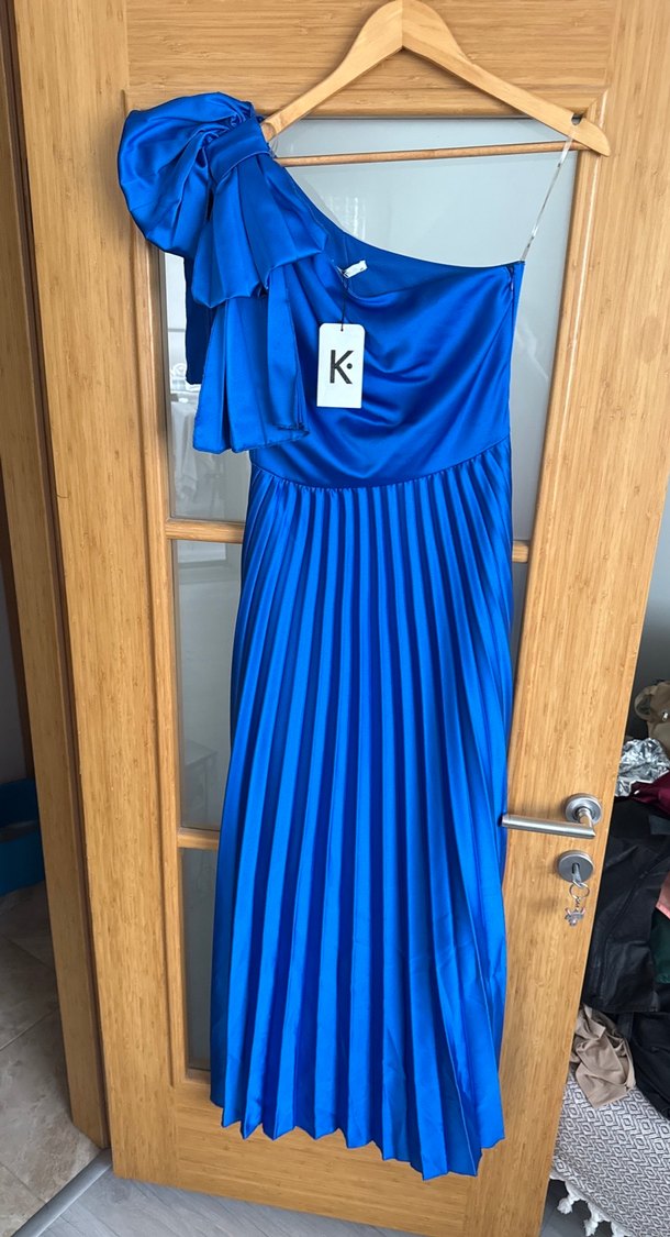 Uzun, koyu mavi renkli bu kadın elbisesi straplez yaka ve ince askılıdır. Pilili etek ve bol kesim tasarımıyla parti için uygundur. Paris tarzı ve 'K' markalıdır.