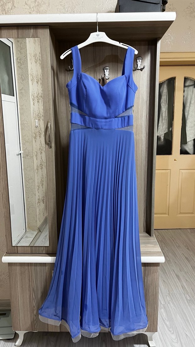Mavi renkli, V yakalı ve kolsuz, pilili uzun abiye elbise. İnce kesimi ve modern klasik tarzıyla düğünler için uygun bir seçim. ✨