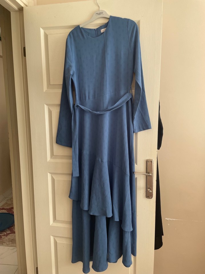 Mavi uzun elbise, salaş kesim ve drapeli detaylara sahiptir. Yumuşak sentetik kumaştan üretilmiş, minimalist ve sade görünüm sunar.