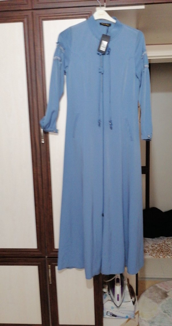 Pastel mavi uzun elbise,normal kesim ve uzun kolludur. Kalın şifon kumaştan, drapeli önü fermanlıdır her yere geyine bilirsiniz Dolabda bekler durur hic geyilmedi
