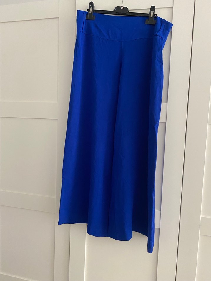 Parlak mavi, uzun boy, salaş kesim kadın pantolon, ipeksi dokulu ve dökümlü tasarıma sahip, minimalist tarz için uygun.