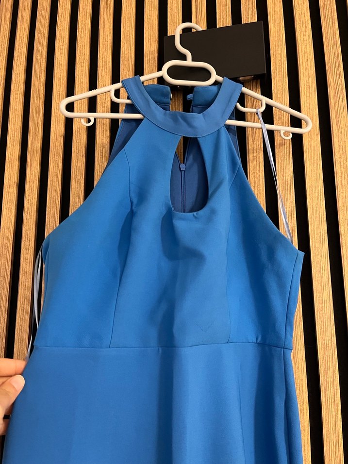 Bu mavi uzun elbise, yüksek yakalı ve ince askılı yapısıyla sırtında fermuarlı, şık ve minimalist bir görünüm sunar. Romantik akşamlar için uygundur.