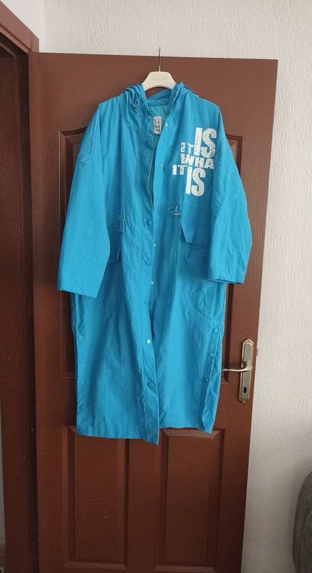 Mavi uzun yağmurluk, bol kesim ve uzun kolludur. Parlak sentetik kumaştan yapılmış, düğmeli ve baskılıdır. Günlük sokak stiline uygundur. ️