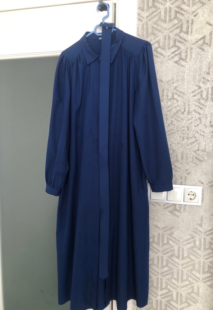 Kadınlar için lacivert, uzun kollu, salaş kesim ve uzun boyda sade bir elbisedir. Normcore tarzda, desensiz ve Paris esintili bir modeldir.