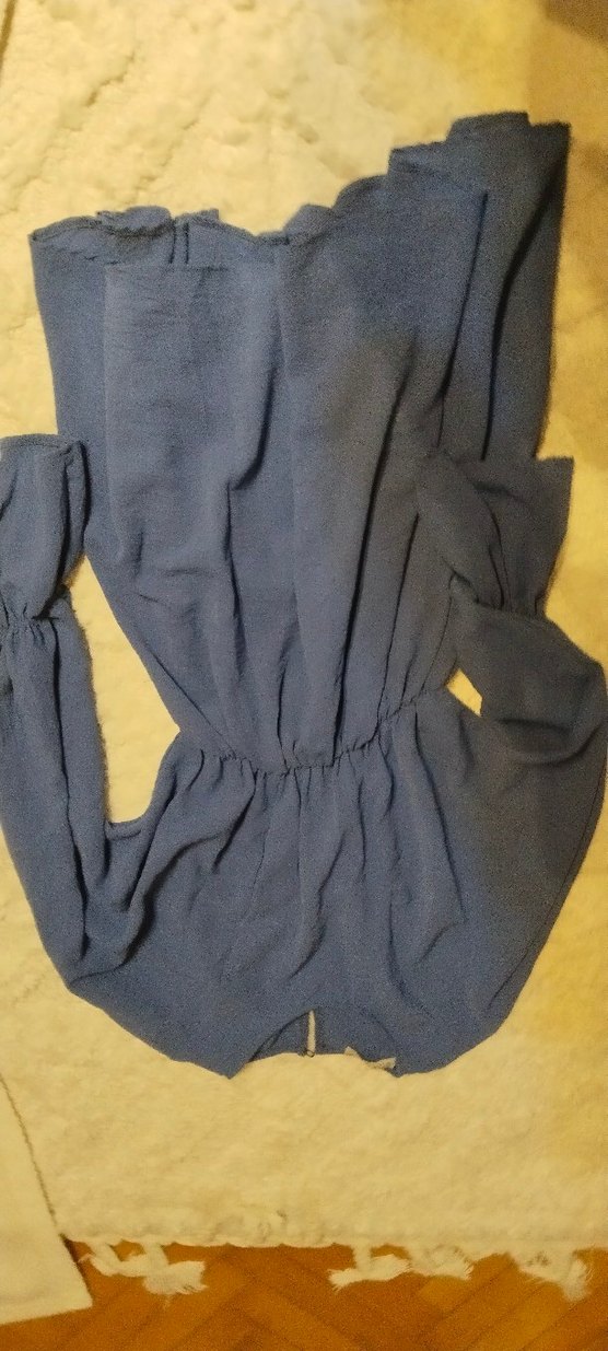 mavi polyester kumaştan, uzun kollu, midi boyda, bol kesim ve dökümlü Minimalist ve bohem tarzda.