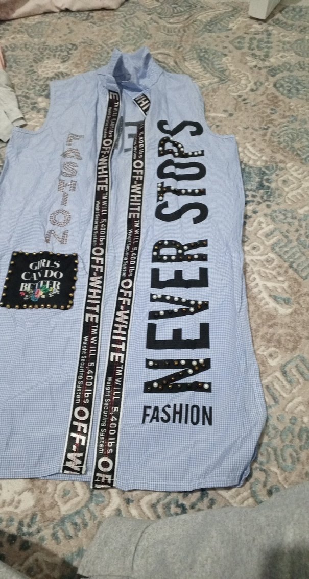 Payetli ve baskılı yazılı desenlerle süslenmiş, askısız yaka ve bol kesime sahip mavi kot uzun tunik. ✨