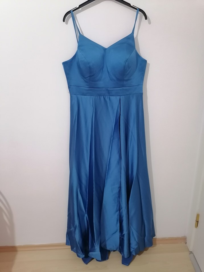 Bu mavi uzun abiye elbise, V yaka ve ince askılara sahip, parlak kumaştan olup drapeli detay içerir, düğünler için uygundur. Sadece 1 kere kullanıldı.