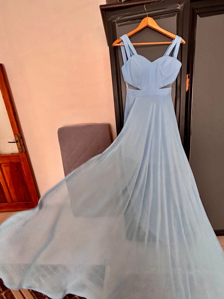 Bu açık mavi uzun abiye, V-yaka ve askılı kollara sahip, drapeli ve vücuda oturan modern klasik bir tasarımdır. Düğünler için minimal ve zarif bir seçenektir.